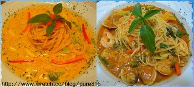 左為海膽汁干貝義大利麵(340),右為紐澳良茄汁海鮮細扁麵(320/299)。