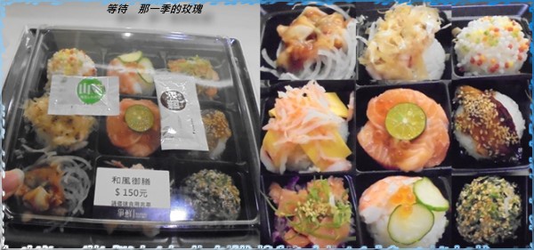 這個九宮格餐盒,裡頭壽司有六格、兩格小菜、一格生魚片,賣150元。