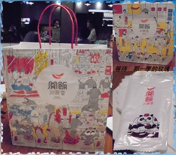 紙袋上的圖,一面是繁忙的廚房,一面是熱鬧的用餐區。